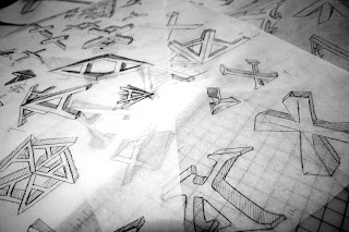 (Shown: 6'' Extruded Letterform Futura Uppercase "Z", Sketches on tracing paper of ideas for 12'' Interpretive Letterform)
